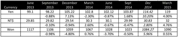 The exchange rates of foreign currencies that define the passive component market index, have been having a major impact on vendors that report their revenues in U.S. dollars. Between October 1, 2014 and December 31, 2014 the yen value to the U.S. dollar increased by 10.2%, followed by an additional 4% gain in the March 2015 quarter. Both the won and the NT$ are also weakening to the dollar as is shown in Figure 1.0 below. The weakening of the won in the March 2015 quarter was greater than expected and this improved reporting for Korean vendors of passive components for the quarter when converted into U.S. dollars.